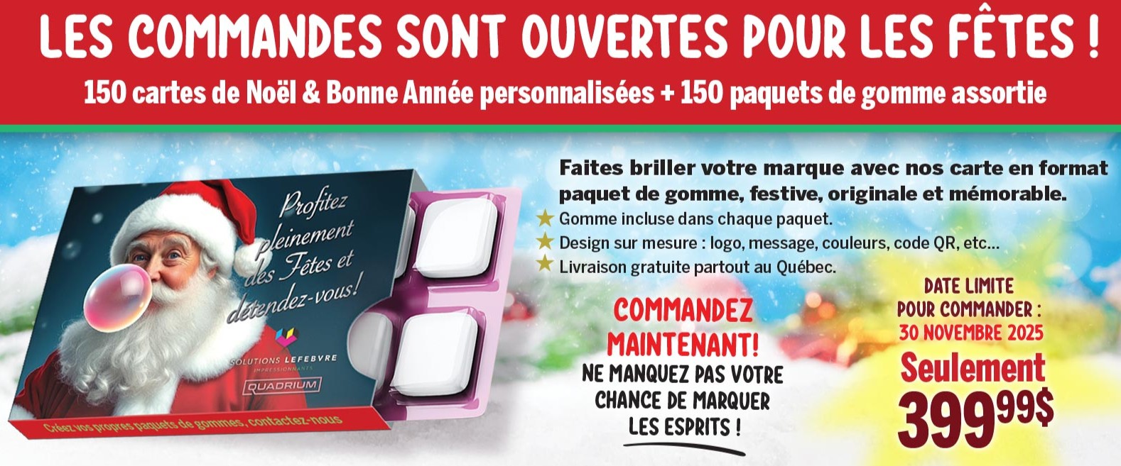 Offrez une surprise originale et rafraîchissante pour les fêtes! Nos cartes de vœux 2026 sont présentées dans un format unique de paquet de gomme, parfait pour marquer les esprits.